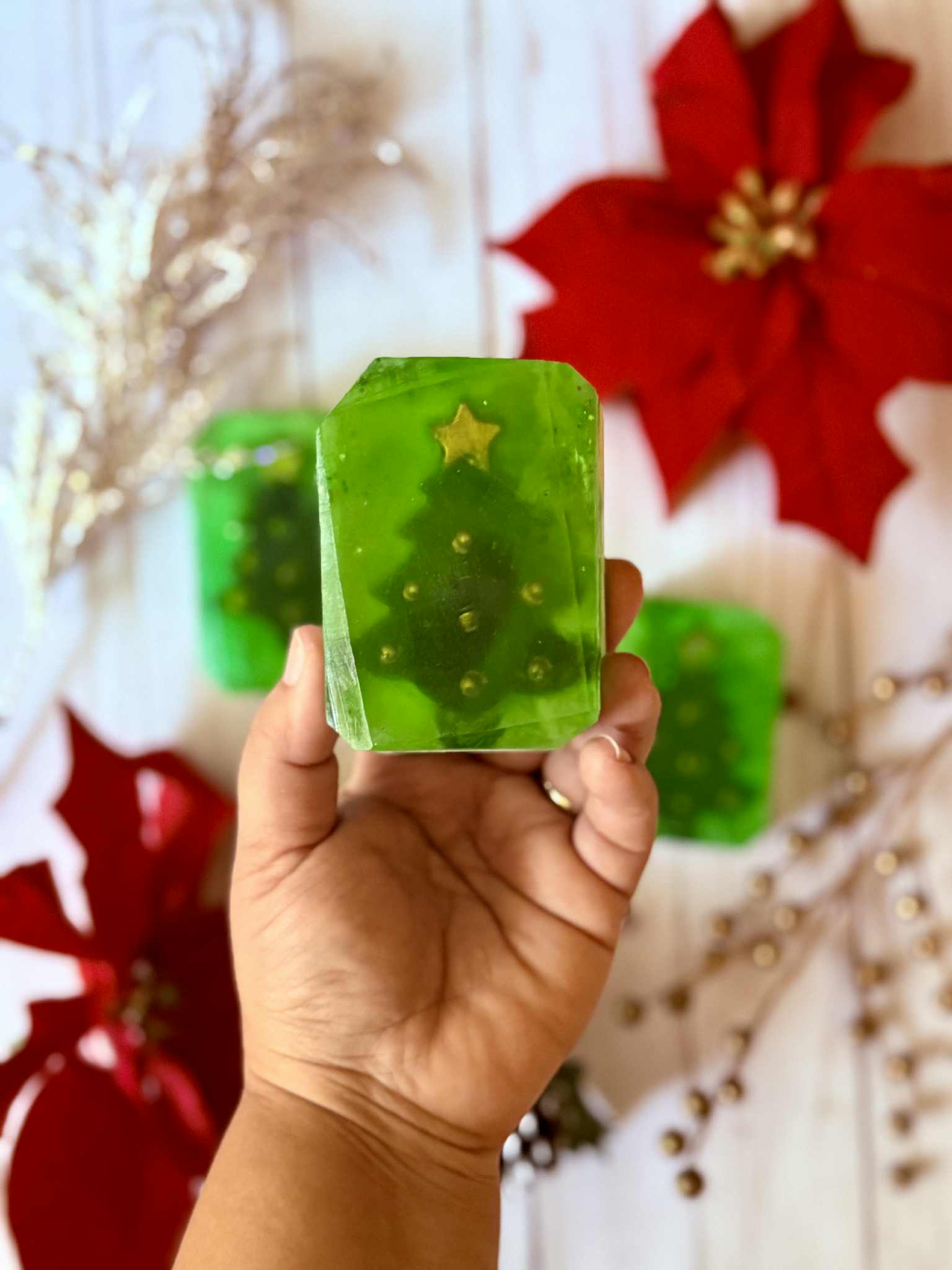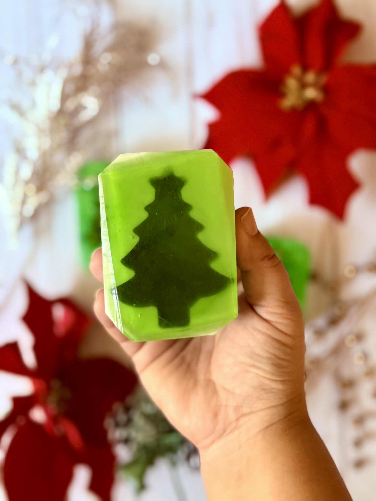 Bring the spirit of the season to your sink or shower with our Christmas Tree Soap Bar, featuring a beautifully crafted evergreen tree embedded at the center. The scent is a fresh and invigorating blend of brisk Frasier Fir, offering a clean, crisp, and refreshing aroma that feels like stepping into a snowy winter forest.