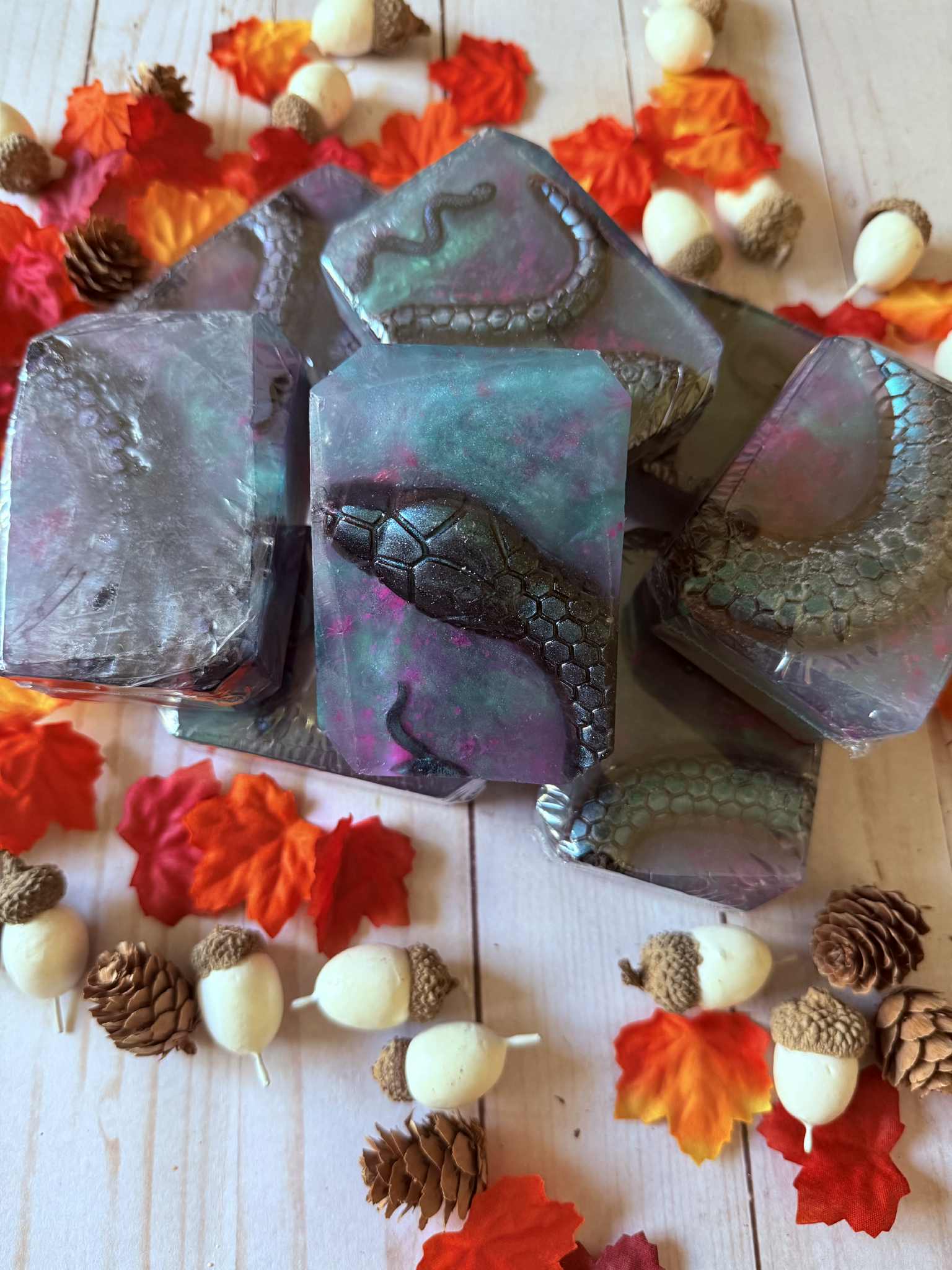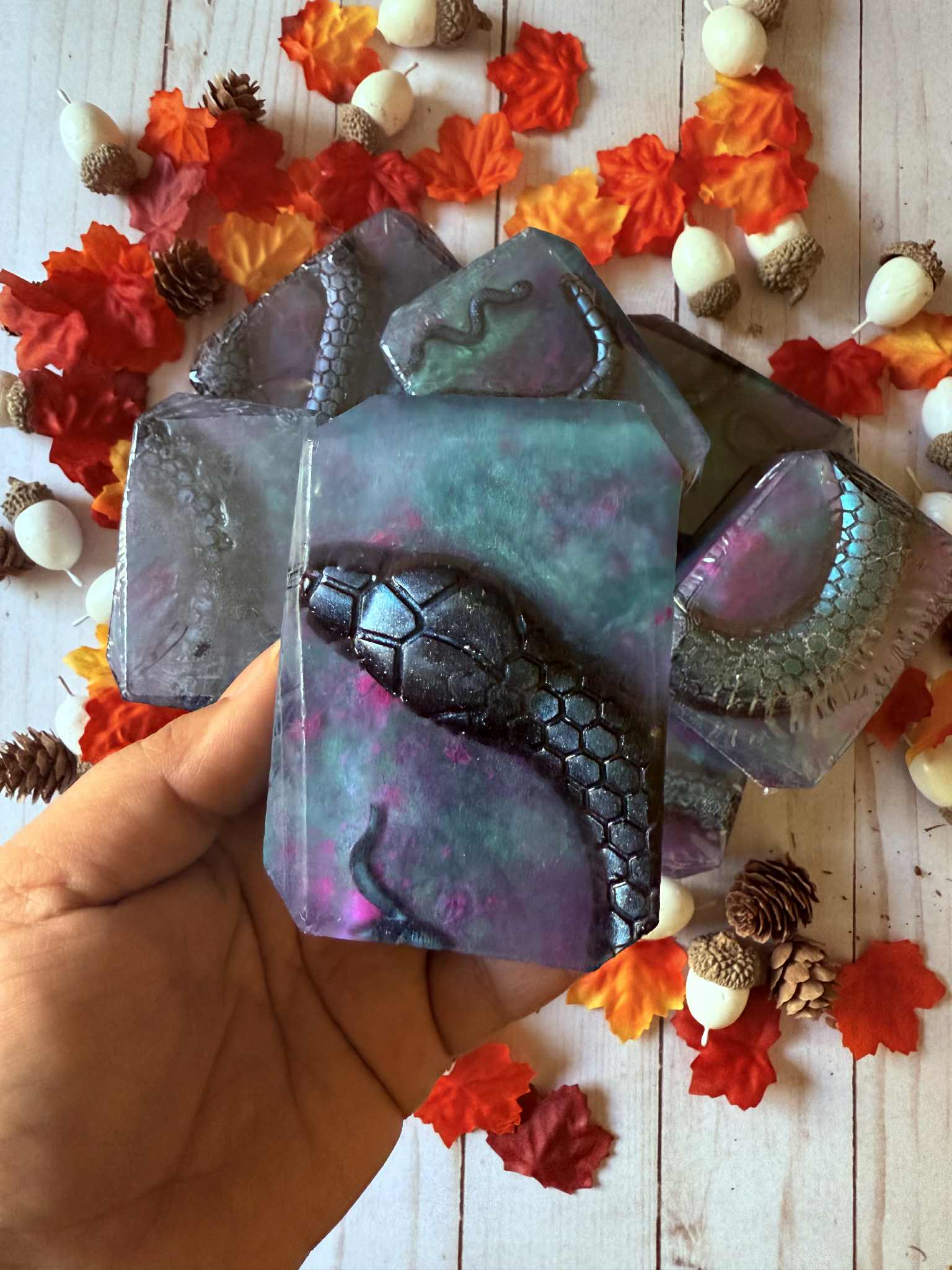 Indulge your senses with our handmade soap bar. This bar is truly unique as each bar contains a piece of the slithering snake. Scented in a captivating blend of warm spices, delicate florals, and grounding woods. Top notes of ginger and black pepper awaken the senses, while ylang ylang, gardenia, jasmine, and orchid add a lush, floral elegance. And it finishes with a warm, lingering base of amber, patchouli, sandalwood, vanilla, and musk.